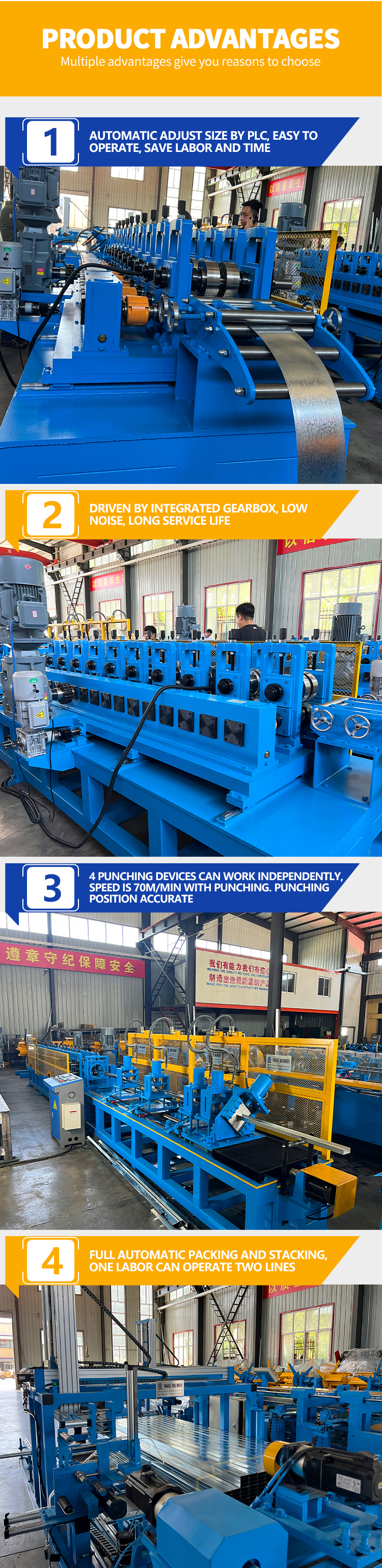Achieve high-speed production with our advanced Stud & Track Roll Forming Machine! Capable of processing at a rate of 70 meters per minute, this machine is equipped with 4 independent punching devices for precise and efficient punching of studs and tracks.